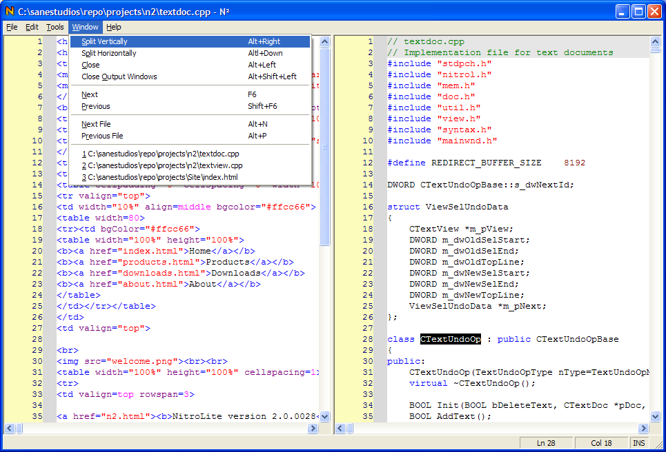 Multi-level undoThe number of undo steps is limited only by system memory. Syntax highlighting for most popular file types Makes editing code easier. Supported file types include C/C++, HTML, Batch files, VBScript, JavaScript and more. The line length in NitroLite is limited only by system memory. The syntax highlighting is easily extended through a configuration file. Copy as HTML and RTF for syntax coloring This provides an easy way to create good looking code snippets for use in HTML pages or Word/Wordpad documents. The following example was generated using NitroLite: <!--Begin Example--> <table width="100%" height="100%"> <tr><td><b><a href="/index.html">Home</a></b></td></tr> </table> <!--End example-->Multiple file support Number of open files is limited only by system memory. NitroLite also allows you to open multiple files directly from the command line (including wildcards and recursively). See the command line reference for more information. Multiple view support Resizable views provides more control over what you see. Also allows you to easily compare files side by side. Configurable tool support with output redirection Allows you to launch command line tools and redirect their output to a NitroLite window. For more information on configuring custom tools, see Using Custom Tools. Command window for executing commands The command window allows you to execute commands and redirect their output to a NitroLite window. Bookmarks Very useful when editing large files. Drop bookmarks in key locations in the file, then easily move between them. Display line numbers NitroLite allows you to display the line numbers to the left of the margin for quick reference. |