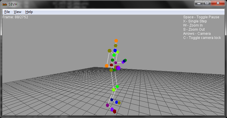 A simple SBVH file viewer. It uses OpenGL and lets you single step through a BVH file and view the skeleton from different camera angles. You can search the web for public motion-capture databases. One popular database can be found here: CMU Graphics Lab. You can download sbvh.exe from here.