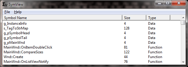 SymView is a small utility for examining symbols contained in an executable. It uses the dbghelp.dll library to enumerate the symbols and displays them in a simple list. Usage: symview executable_name. You can download symview.exe from here.